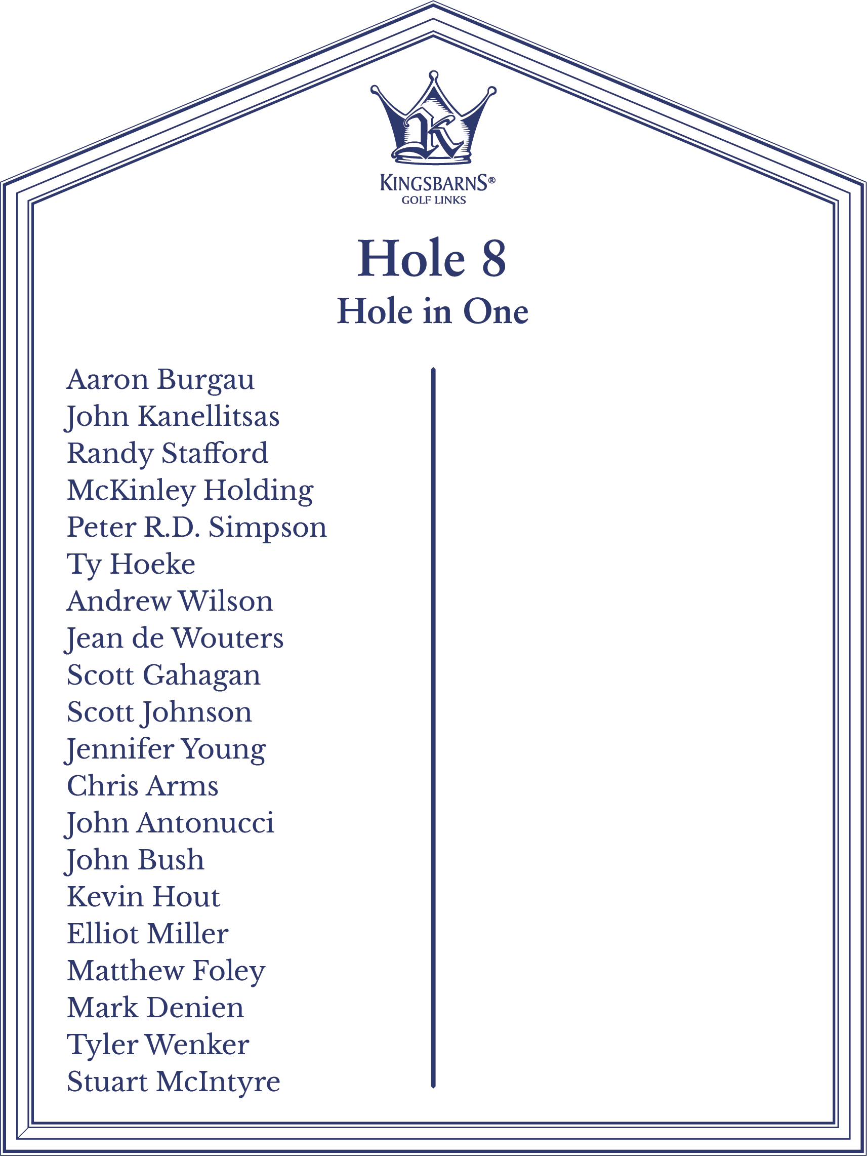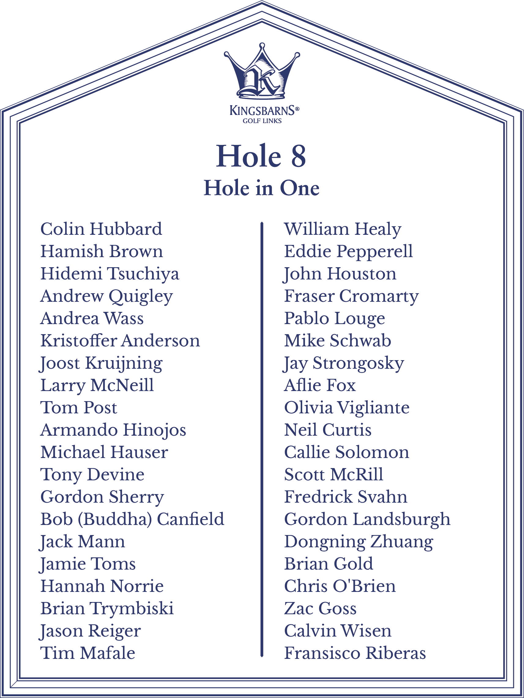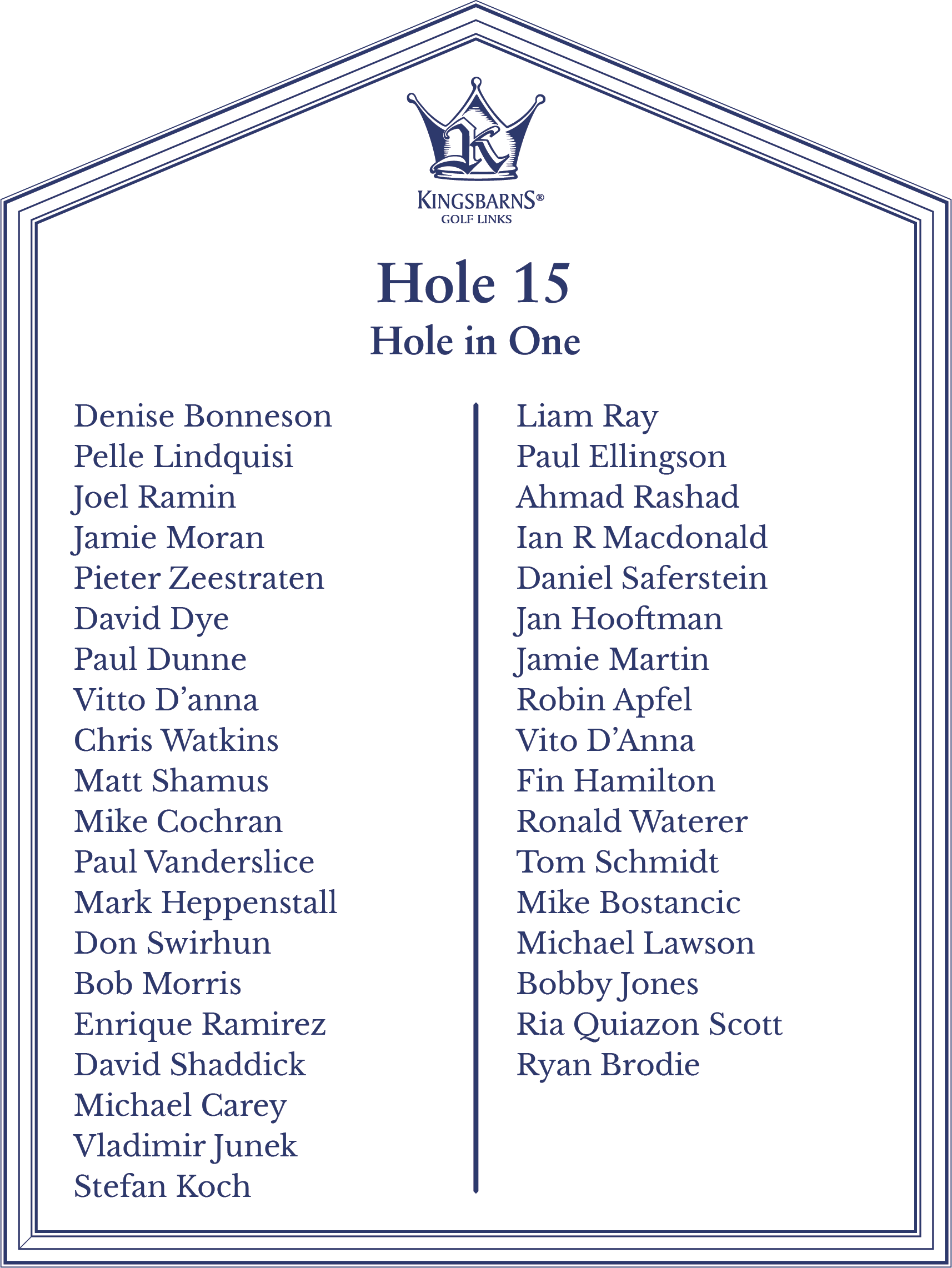 Hole 8 - Scott Johnson ✦ Hole 2 - Brian Ricks ✦ Hole 8 - Jennifer Young ✦ Hole 8 - Chris Arms ✦ Hole 15 - Ria Quiazon Scott ✦ Hole 13 - Peter Meynen ✦ Hole 8 - Jean de Wouters ✦ Hole 15 - Bobby Jones ✦ Hole 8 - Scott Gahagan ✦ Hole 13 - Joshua Nilsen ✦ Hole 2 - Joe Henner ✦ Hole 8 - John Antonucci ✦ Hole 8 - John Bush ✦ Hole 8 - Kevin Hout ✦ Hole 8 - Elliot Miller ✦ Hole 6 - Alexander Kapulica (Albatross) ✦ Hole 6 - Brendan Reilly (Albatross) ✦ Hole 8 - Matthew Foley ✦ Hole 2 - John Moffat III ✦ Hole 13 - Tiziana Dallamano ✦ Hole 13 - William Fallstrom ✦ Hole 15 - Ryan Brodie ✦ Hole 8 - Mark Denien ✦ Hole 8 - Tyler Wenker ✦ Hole 9 - Aaron Rollings (Albatross) ✦ Hole 2 - Brad Bauer ✦