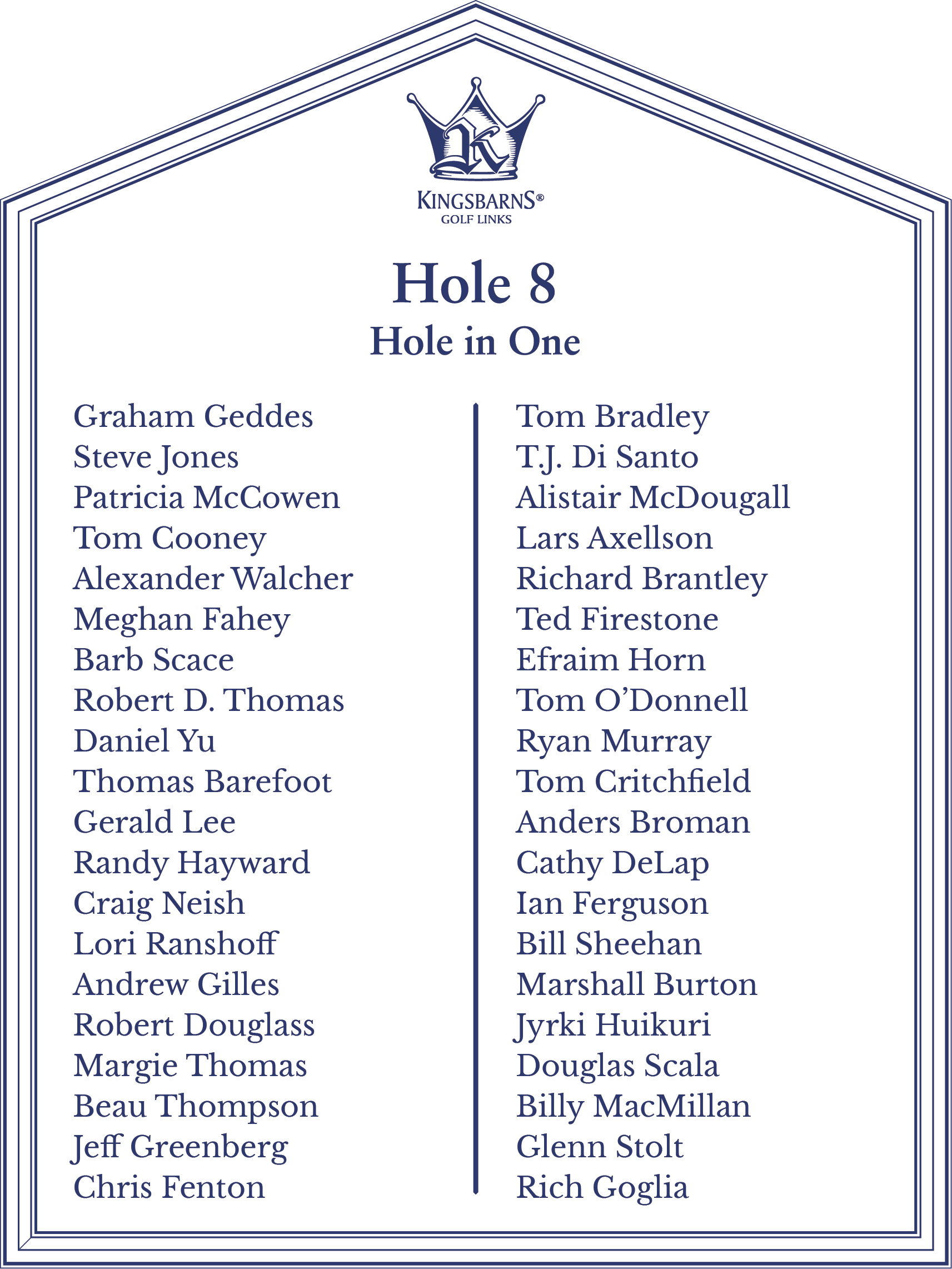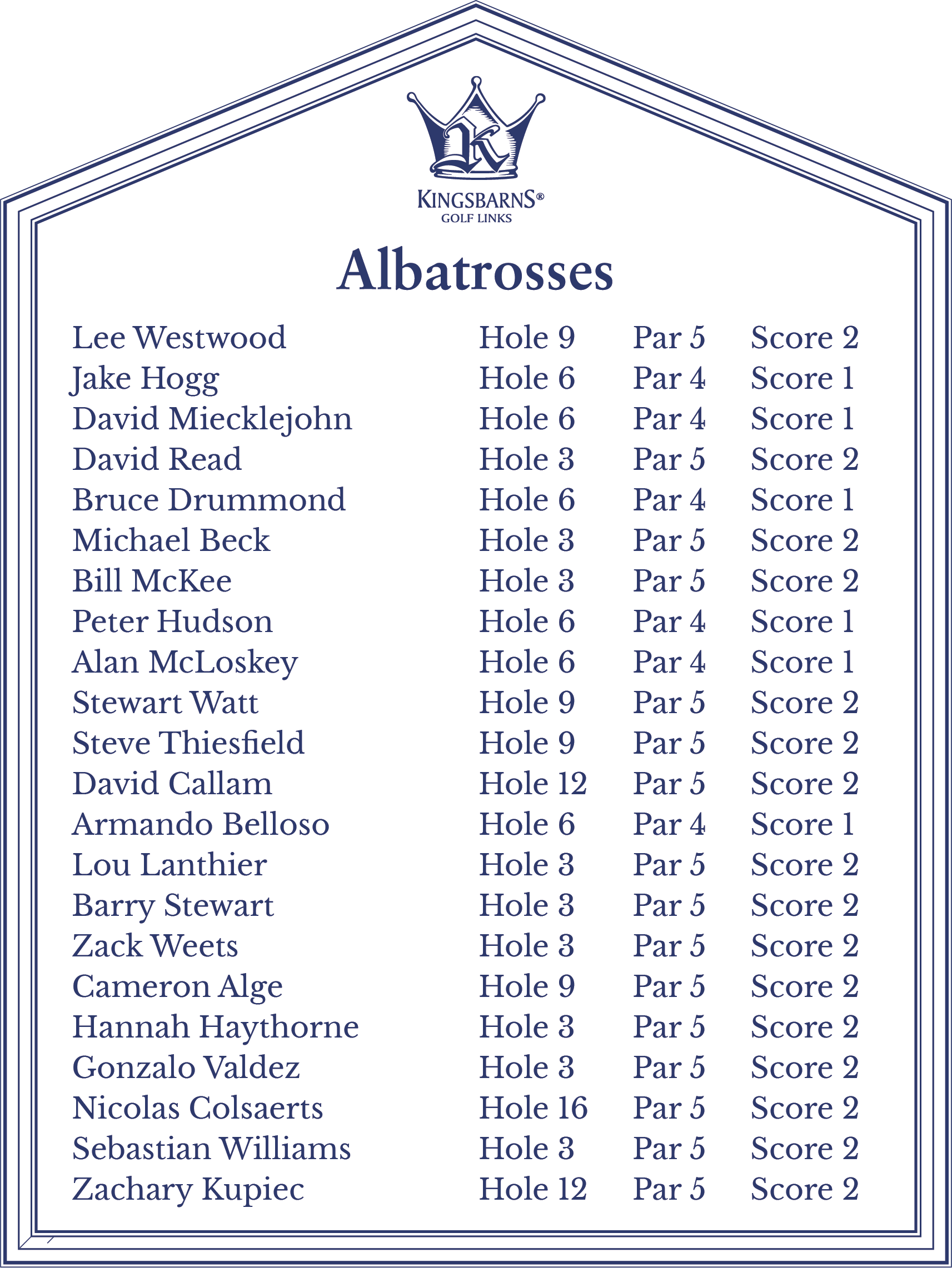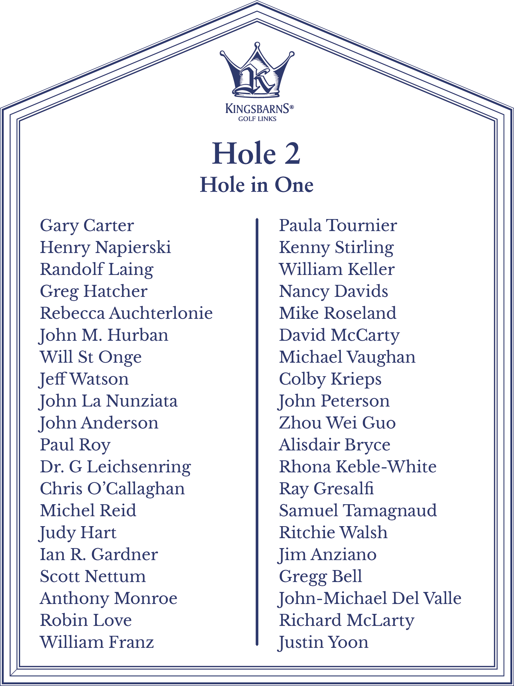 Hole 8 - Scott Johnson ✦ Hole 2 - Brian Ricks ✦ Hole 8 - Jennifer Young ✦ Hole 8 - Chris Arms ✦ Hole 15 - Ria Quiazon Scott ✦ Hole 13 - Peter Meynen ✦ Hole 8 - Jean de Wouters ✦ Hole 15 - Bobby Jones ✦ Hole 8 - Scott Gahagan ✦ Hole 13 - Joshua Nilsen ✦ Hole 2 - Joe Henner ✦ Hole 8 - John Antonucci ✦ Hole 8 - John Bush ✦ Hole 8 - Kevin Hout ✦ Hole 8 - Elliot Miller ✦ Hole 6 - Alexander Kapulica (Albatross) ✦ Hole 6 - Brendan Reilly (Albatross) ✦ Hole 8 - Matthew Foley ✦ Hole 2 - John Moffat III ✦ Hole 13 - Tiziana Dallamano ✦ Hole 13 - William Fallstrom ✦ Hole 15 - Ryan Brodie ✦ Hole 8 - Mark Denien ✦ Hole 8 - Tyler Wenker ✦ Hole 9 - Aaron Rollings (Albatross) ✦ Hole 2 - Brad Bauer ✦